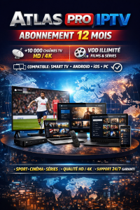 Profitez d’un abonnement Atlas Pro IPTV 12 mois offrant un accès complet à des milliers de chaînes TV internationales ainsi qu’à une large bibliothèque de films et séries en vidéo à la demande (VOD).