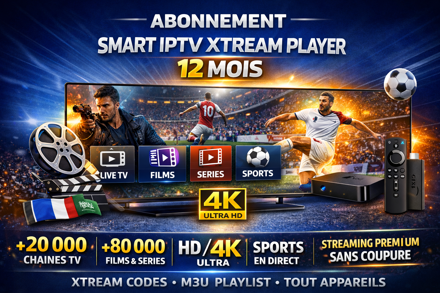 Profitez d’un abonnement Smart IPTV Xtream Player 12 mois offrant une expérience IPTV premium avec accès à des milliers de chaînes TV en direct ainsi qu’à une large bibliothèque de films et séries en VOD.